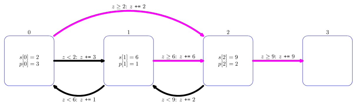 如果英雄的能力值大于等于敌人 $i$ 的能力值 $s[i]$,那么英雄会胜出。这使得英雄的能力值增加 $s[i]$($s[i] \ge 1$)。这种情况下,下一步英雄将会进入地牢 $w[i]$($w[i] > i$)。
